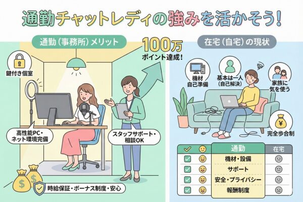 以上、通勤チャットレディとして100万ポイントを達成するためのポイントをお伝えしました。