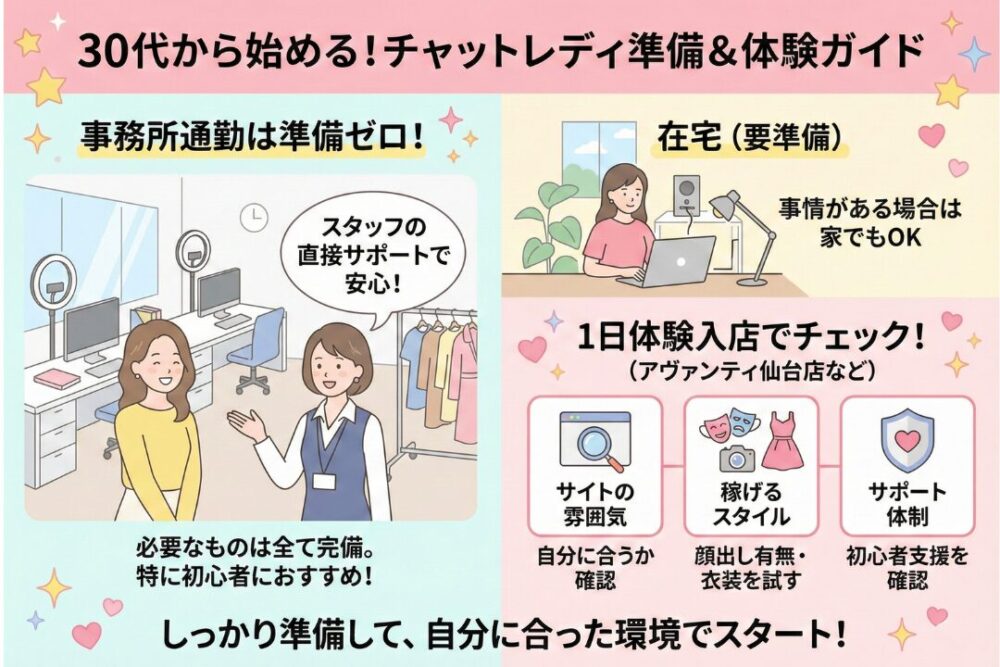 30代から初めてチャットレディに挑戦するという方は特に、スタッフのサポートを直接受けられるので断然通勤がおすすめです。