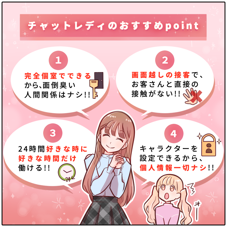 チャットレディはお客さんと会わない分疲れにくくて、ピリピリしなくていいです!部屋も綺麗で過ごしやすいです。